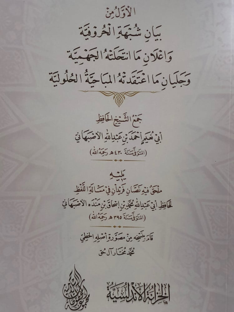 الاول من بيان شبهة الحروفية واعلان ما انتحلته الجهمية وجليان ما اعتقدته المباحية الحلولية - ويليه - ملحق فيه نصان فريدان في مسالة اللفظ / غلاف