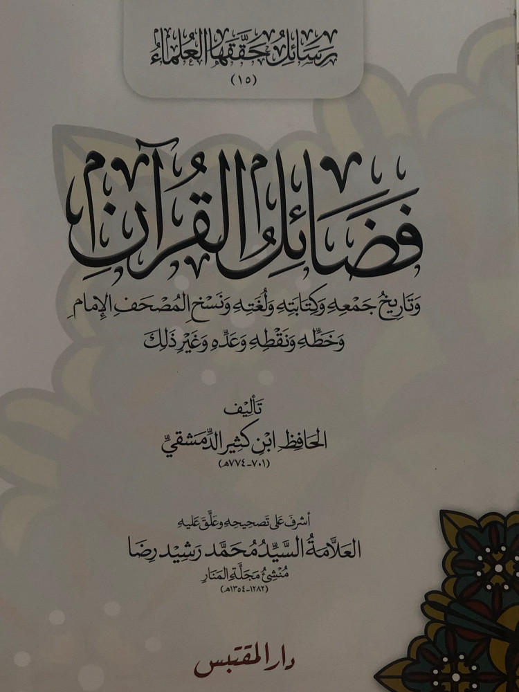 فضائل القران وتاريخ جمعه وكتابته ولغته ونسخ المصحف الامام وخطه ونقطه وعده وغير ذلك / غلاف